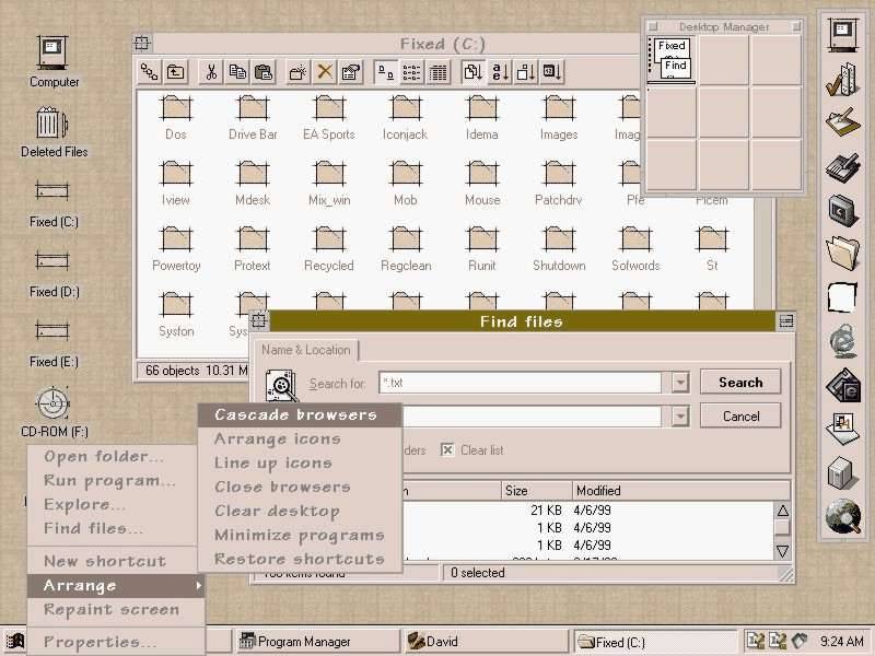 Screenshot of Calmira with "Drawing Board" icon and colour scheme. Notes: * Icons, colours and background were grabbed from various Web screenshots of the D-Board scheme running on Mac, KDE and Win9x machines. * Icons were combined into a DLL and configured with CalTheme. * Window font installed using the SysFon utility. * Toolbar and desktop manager configured with ToolPal. David www.d.burgess.clara.net