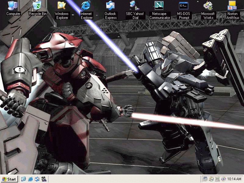 This is my Window for Workgroups 3.11 desktop set up to look as much like WinXP as I could get it. I have Calmira 3.25 installed, along with custom high-color replacements for most icons, including My Computer, Recycle Bin, Windows Explorer, and the Start menu, along with a custom XP start logo. It is running on a Pentium 133Mhz PC with 16MB RAM set to 16-bit color, 800x600 resolution. (screenshots are dithered 256 colors for animated GIF) I also have used PatchDrv to install the custom XP-style bitmaps to replace the Min/Max/Close buttons. It also has Internet Explorer/Outlook Express 5 and Netscape Communicator 4.08 installed, with replacement icons from Netscape 6.2 and the WinXP versions of IE/OE6. The wallpaper is from the opening video of Armored Core: Master of Arena. (PlayStation game) If anyone is interested, both the XP-style bitmaps (created by Josi Lspez) and the high color XP-style icons are available from my site's Windows 3.1x section. -PC Freak PC Freak's WebZone http://pcfwebzone.vze.com